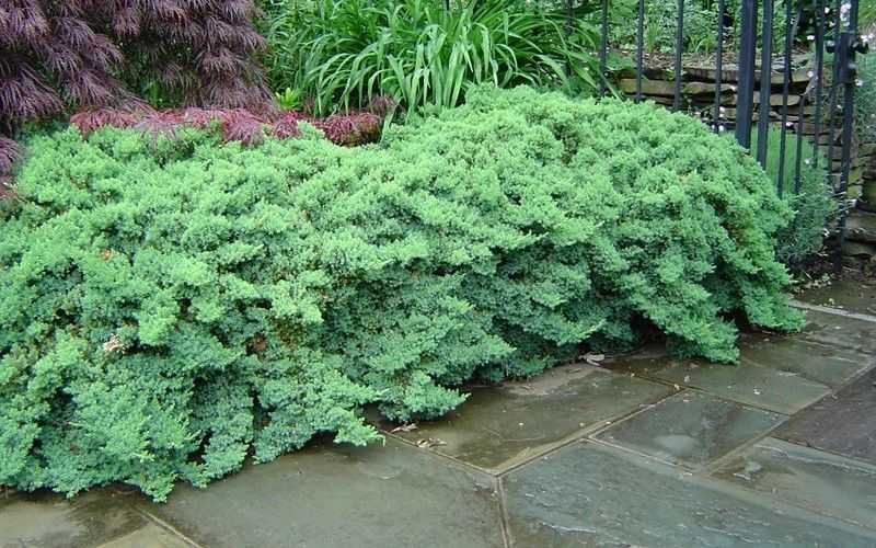 Можжевельник лежачий Нана Представленная на фото каталога культура широко культивируется на территории Японии. В этой стране она встречается в горах в диком виде. Это разновидность можжевельника китайского. Декоративная форма выращена в питомнике D.Hill Nursery Co, который находится в Америке. В 1904 году растение поступило в общую продажу. Ботаническое описание У можжевельника лежащего Нана довольно медленные темпы роста. В среднем годичный прирост в ширину равен 5 – 7 см, а в высоту – 2 – 3 см. В 10-летнем возрасте размер саженцев колеблется в пределах 30 см в высоту, и 75 см в диаметре. В дальнейшем хвойник разрастается до 150 см в диаметре и 50 см в высоту. Хвоя мелкая – шириной 2 мм и длиной около 8 мм. Она шиловидная, густо размещена на ползучих побегах, зелёно-голубой окраски. Крона широкораспростёртая, горизонтальной формы. Молоденькие побеги гибкие, стелющиеся по почве. Постепенно они становятся жёсткими и приподнимаются над землёй в центральной части кустарника. Применение Можжевельник лежащий Нана пользуется большим спросом среди садоводов и ландшафтных дизайнеров. Благодаря аккуратной кроне он считается универсальной культурой и подходит для озеленения небольших дачных участков. Многолетник часто применяют в качестве почвопокровного растения для придания цветного акцента в групповых посадках. Это идеальный вариант для украшения рокариев, альпийских горок и многоярусных композиций. Также можжевельник этого сорта выращивают в контейнерах для украшения балконов, открытых лоджий и веранд, террас и садов на крыше. Агротехника Почвы можжевельник лежащий Нана любит разные. Главное чтобы они были хорошо дренированные, относительно плодородные и увлажнённые. Также саженцы переносят незначительное затенение, но лучше выбирать солнечные места. Корневая система хвойника интенсивно оплетает крупные камни, которые послужат для неё надёжным фундаментом. Прежде чем начать высадку рассады, необходимо подготовить почвенную смесь для заполнения лунки. С этой целью смешивают лиственную землю с торфом, перепревшим навозом и речным песком. На дно укладывают слой дренажа из битого кирпича, керамзита или мелкой гальки. Далее саженец осторожно достают из ёмкости, стараясь сохранить целостность земляного кома. Сразу же растение помещают в посадочное углубление, строго в вертикальном положении. Свободное пространство засыпают почвосмесью и слегка утрамбовывают. В приствольную зону наливают 1 – 2 ведра воды. Вырастить можжевельник лежащий Нана сможет даже новичок в садоводстве. Полив проводят преимущественно в период длительной засухи. Расход жидкости на 1 взрослый кустарник – 1 – 2 ведра. Не лишним будет дождевание кроны, которое осуществляется 1 раз в неделю. Время от времени рекомендуется рыхлить землю вокруг ствола, одновременно удаляя сорную траву. Подкармливать многолетник лучше с приходом весны. С этой целью используют Нитроаммофоску (на 1 растение 30 – 40 г). Удобрение заделывают в землю, после чего щедро поливают. Если можжевельник посажен в слишком бедный грунт, то подкармливают его в течение всего вегетационного сезона. Однако процедуру проводят с перерывом в 4 недели. Можжевельник лежащий Нана хорошо переносит прореживающую и санитарную стрижку. Ранней весной удаляют все сломанные и сухие ветви. Также можно скорректировать д